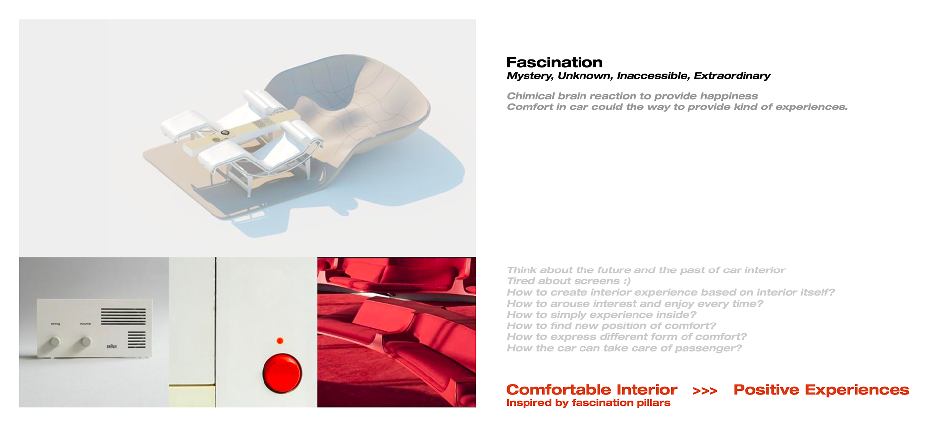 Fascination as a personal starting point, but common to all people. It can be defined by 4 pillars and will allow to characterize an experience of comfort. Comfort being my vision of positive experiences in the car. All forms of comfort are a way to create a final positive experience that could fascinate. Bringing enjoyment through a simple dedicated interior